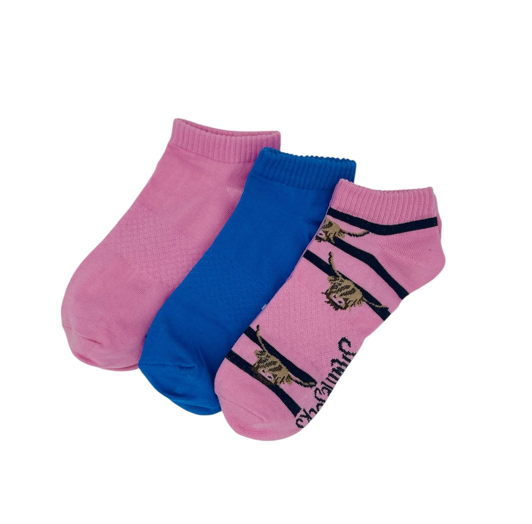 Highland Cow trainer socks trio: choose from Pink Highland Cow / White / Navy or Pink Highland Cow/ Pink / Blue.